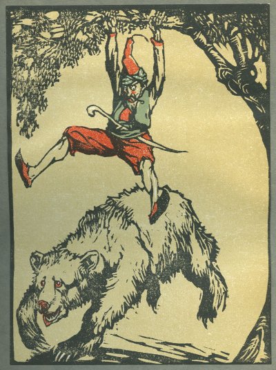 hiding-place the mounted escort left our hero in the lurch and rode back. Mustafa spurred his steed, but the animal would not move, and the bear came at him with ungainly strides. Seeing a tree close at hand, our hero sprang on to the back of his horse, clutched at the overhanging branches, and pulled himself up. The bear came underneath the tree and was preparing to ascend when Mustafa, letting go his hold, alighted on its back, and boxed bruin's ears so severely that he set off in the direction the horsemen had taken. Catching sight of them, he yelled: "Kara Mustafa, the hero, is coming!" Whereon they all wheeled round, and, understanding the situation, dispatched the bear with their lances.