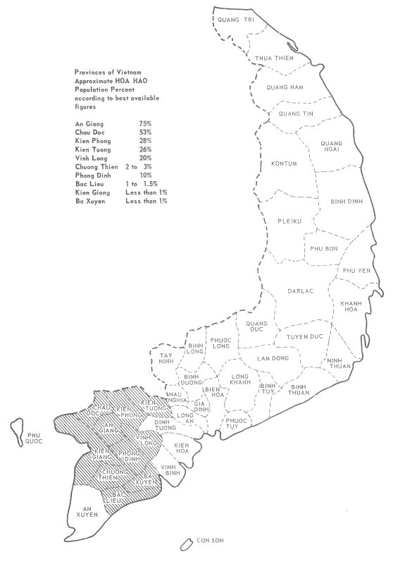 Location: The HOA HAO are located in the Mekong Delta with the major concentration in the provinces of Chau Doc, Kien Phong, An Giang, Kien Giang, Vinh Long, Phong Dinh, Chuong Thien, Bac Lieu, Ba Xugan, and Kien Tuong. They form a belt across the delta from Cambodia to the South China Sea, and include the southern portion of South Vietnam with the exception of the extreme southern province of An Xuyen and the island province of Phu Quoc. While there are HOA HAO to be found scattered throughout other provinces of South Vietnam, their numbers give them neither political nor military significance on a par with the ten listed provinces.