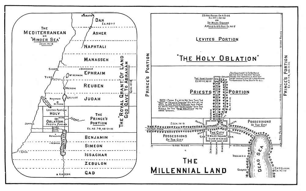 In the centre of this section the City (Jerusalem) is located. This helps us to map out the whole of the "Holy Oblation," as the "New City" is to be located on the site of the Old. The "New City," however, is to be much larger than the Old. It is to be 9 miles square, and with its suburbs, ½ mile on a side, 10 miles square. It will have a wall around it with 3 gates on each side like the New Jerusalem (Ezek. 48:15-18, 30-35), these gates being named after the 12 sons of Jacob.