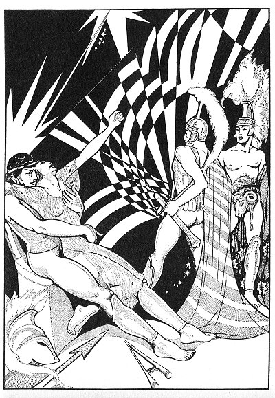 robe and tunic off my body and played with me. They slapped and beat me about my thighs till my nether part was burning red. Then they lifted their own tunics and made me sink down in their laps so that I felt very much ashamed. Then they obliged me to take . . . . . . between my lips, saying: "Try a new melody, genial little flute player!"