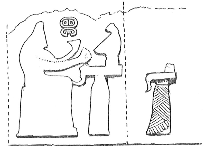 That which seems to us in our present enquiry the chief feature of these sculptures is that the worship is clearly common to the god and the goddess, who occupy the leading positions in equal prominence. 28 This interpretation is supported substantially by sculptures which decorate the main entrance of the neighbouring Hittite city of Eyuk. The corner stone on the right represents the goddess seated, 29 receiving the worship of her priests; while the corresponding corner stone on the left shows a Bull-God on a pedestal, 30 with the High