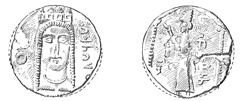 In two cases, however, the figure of the god does survive. One of these coins of the period of Alexander, 62 shows upon the obverse the figure of the god seated upon a throne, holding in his left hand a long sceptre, and in the right hand something which is not distinct. On the reverse side of the coin, the goddess is represented clad in long robes, with girdle, seated upon a lion; she holds in her left hand, it would seem, the lightning trident. 63