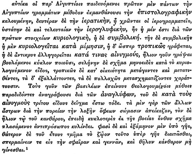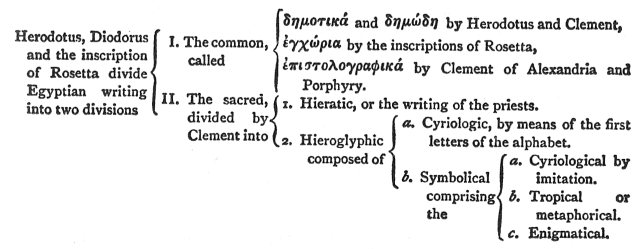 Translation of extract from Clement."For example, those that are educated among the Egyptians first of all learn that system of Egyptian characters which is styled EPISTOLOGRAPHIC; secondly, the HIERATIC, which the sacred scribes employ; lastly and finally the HIEROGLYPHIC. The hieroglyphic sometimes speaks plainly by means of the letters of the alphabet, and sometimes uses symbols, and when it uses symbols, it sometimes (a) speaks plainly by imitation, and sometimes (b) describes in a figurative way, and sometimes (c) simply says one thing for another in accordance with certain secret rules. Thus (a) if they desire to write sun or moon, they make a circle or a crescent in plain imitation of the form. And when (b) they describe figuratively (by transfer and transposition without violating the natural meaning of words), they completely alter some things and make manifold changes in the form of others. Thus, they hand