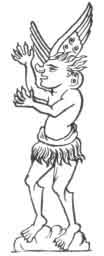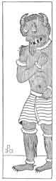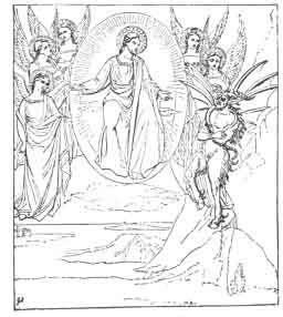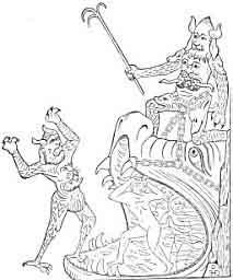 442:1 I A Persian Devil appears in an engraving in the Didron collection in the form of a man, clothed and wearing necklets, bracelets, and anklets, but with claws on his heels and toes, and horns on his head. He is named Ahriman, Spirit of Darkness, the Iranian enemy of Ormuzd, second-born of the Eternal One, like Ormuzd an emanation from the Primal Light; equally pure, but ambitious and full of pride, he had become jealous of the first-born of God."--Didron, Iconography, II., p. 122.
