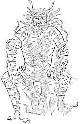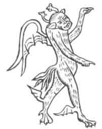 442:2 From a Turkish MS. obtained by Napoleon I. at Cairo and presented to the National Library at Paris (S.C. 242). Its author is Saïaidi Mahammed ebu emer Hassan esseoudi (990an), and the picture is described as follows: "The flesh of this monster is olive, his eyes are green with red pupils, and his tongue is also red. He wears a green scarf around his loins, pale purple trousers lined with blue, and necklets and armlets of gold."--Didron, Iconography, II., 122.