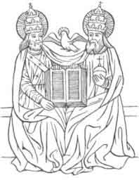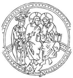 445:2 The remarkable feature of this picture consists not only in admitting the Virgin Mary to the throne of the Trinity (which is quite frequent in similar representations) but in the double presence of Christ, as a full-grown man and as an infant.