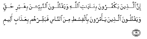 21. Inna allatheena yakfuroona bi-ayati Allahi wayaqtuloona alnnabiyyeena bighayri haqqin wayaqtuloona allatheena ya/muroona bialqisti mina alnnasi fabashshirhum biAAathabin aleemin