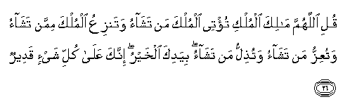26. Quli allahumma malika almulki tu/tee almulka man tashao watanziAAu almulka mimman tashao watuAAizzu man tashao watuthillu man tashao biyadika alkhayru innaka AAala kulli shay-in qadeerun