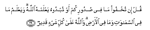 29. Qul in tukhfoo ma fee sudoorikum aw tubdoohu yaAAlamhu Allahu wayaAAlamu ma fee alssamawati wama fee al-ardi waAllahu AAala kulli shay-in qadeerun