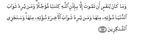 145. Wama kana linafsin an tamoota illa bi-ithni Allahi kitaban mu-ajjalan waman yurid thawaba alddunya nu/tihi minha waman yurid thawaba al-akhirati nu/tihi minha wasanajzee alshshakireena