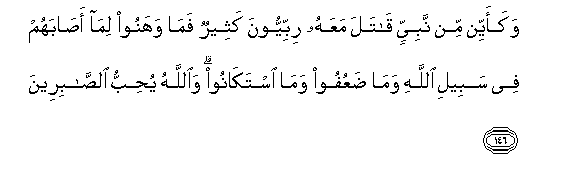 146. Wakaayyin min nabiyyin qatala maAAahu ribbiyyoona katheerun fama wahanoo lima asabahum fee sabeeli Allahi wama daAAufoo wama istakanoo waAllahu yuhibbu alssabireena