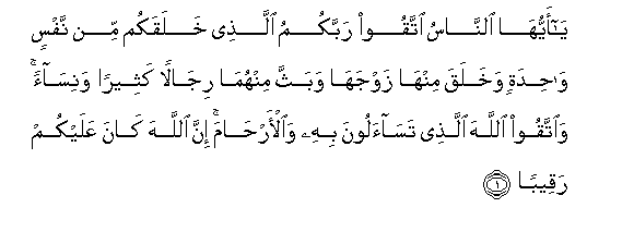 1. Ya ayyuha alnnasu ittaqoo rabbakumu allathee khalaqakum min nafsin wahidatin wakhalaqa minha zawjaha wabaththa minhuma rijalan katheeran wanisaan waittaqoo Allaha allathee tasaaloona bihi waal-arhama inna Allaha kana AAalaykum raqeeban