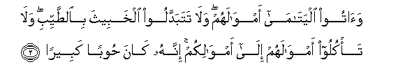2. Waatoo alyatama amwalahum wala tatabaddaloo alkhabeetha bialttayyibi wala ta/kuloo amwalahum ila amwalikum innahu kana hooban kabeeran