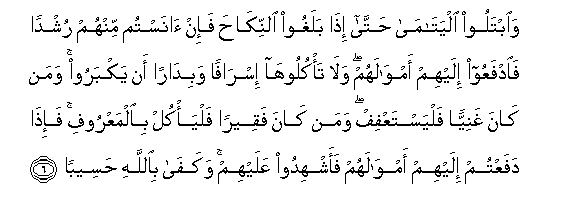 6. Waibtaloo alyatama hatta itha balaghoo alnnikaha fa-in anastum minhum rushdan faidfaAAoo ilayhim amwalahum wala ta/kulooha israfan wabidaran an yakbaroo waman kana ghaniyyan falyastaAAfif waman kana faqeeran falya/kul bialmaAAroofi fa-itha dafaAAtum ilayhim amwalahum faashhidoo AAalayhim wakafa biAllahi haseeban