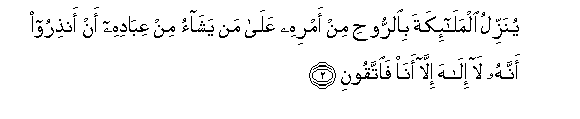 2. Yunazzilu almala-ikata bialrroohi min amrihi AAala man yashao min AAibadihi an anthiroo annahu la ilaha illa ana faittaqooni