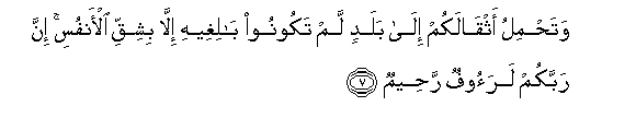 7. Watahmilu athqalakum ila baladin lam takoonoo baligheehi illa bishiqqi al-anfusi inna rabbakum laraoofun raheemun