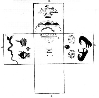 FIGURE 1. Kiva floor and murals. Central panel shows floor with medicine men (X X X) sitting behind altar, with shipapu kuwatsaishuma (O), medicine bowl (