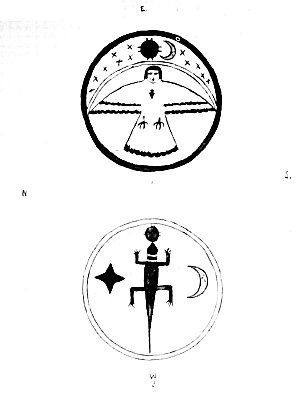 FIGURE 2. Altar sand paintings. a, Fire society altar: The rim (blue) is the sky; the upper crescent contains the symbols for the sun (red), moon (yellow), and stars; the arc (pale gray) is the Milky Way; the face (yellow with black hair) below, Iatiku; and the spots (yellow) represent the earth; the triangular object (red) on breast is the heart, the center of the earth and the center of the picture. b, Ant society altar: Circle (pale gray) and spots (yellow) are of corn meal; star, blue; sun, red; moon, yellow. The lizard (green with 4 bands--yellow, blue, red, white--around throat) can eat ants and gives power to cure a person afflicted with itching caused by ants.