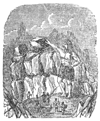 We take the pleasant pathway across the fields from Mousehole to Lamorna: if the tide be out, we pass down over the cliff at the foot of Regennis hill, to see the cavern known as the Mouse-hole. This cavern is about fifty feet high at the entrance, and is said to extend to a great distance under the cliff; but, from being so low and narrow, it is not easily explored. The almost perfect arch of the cavern is adorned with a luxuriant growth of Asplinum marinum and other delicate and graceful ferns. On the cliff, near the sawn, are masses of creeping wild flowers: among others, trailing close to the water's edge, is a variety of the great bind-weed, remarkable for having beautiful pink-striped flowers. Ascending Regennis hill, we pass over a stile on the left, and are on the path which winds along near the shore, and which affords a splendid sea-view with a foreground (in many places) of towering cairns and picturesque crags. On the way we come to the farm-house of Lower Kimyal, and its surrounding cottages. This place is remarkable as the scene of an incident in one of the most romantic of the many wild legends of the west. We will give the story, as it is generally narrated by the old folks of Buryan, to which parish it belongs, rather than to that of Paul. This legend will give us many glimpses of the inner life and feelings of the ancient people, and enable us to understand how the wildly-poetical stories of the Cornish drolls may still tincture the Celtic race, just as tales of terror, related by an ignorant and superstitious nurse, make an impression in the infant mind never to be entirely obliterated; and the ghost, demon, or bucca-dhu, with which the child is frightened, remains as a dim and unpleasant