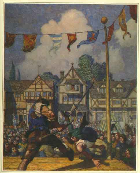 It was a fête day, and folk crowded into Nottingham by all gates. These had been lowered hospitably and were to remain down all day. The stages had been erected for quarterstaff.