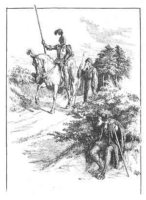 man, and he seemed to be acting as guide to the Knight, who carefully checked his prancing horse to keep pace with his slow footsteps.