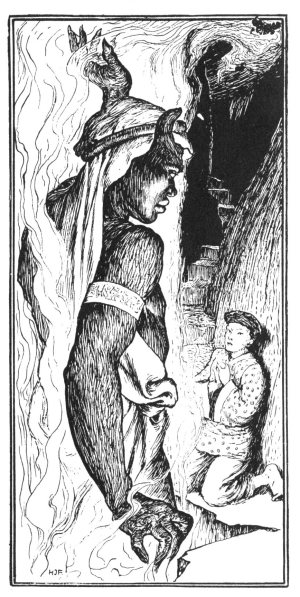 For two days Aladdin remained in the dark, crying and lamenting. At last he clasped his hands in prayer, and in so doing rubbed the ring, which the magician had forgotten to take from him. Immediately an enormous and frightful genie rose out of the earth, saying: