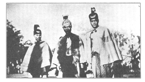 CHIEFS IN FEATHER CLOAKS AND HELMETS