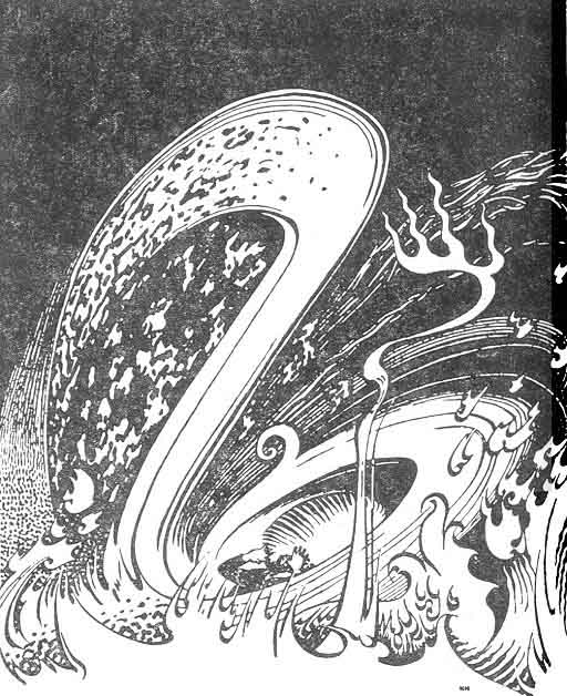 All they were silent, eyeing her as she walked delicately past the table. She looked with a distant and, to outward seeming, uncomprehending eye on the dead feasters and their empty cups. Empty all, save that one passed on by Viglus, whereof Corsus would not drink; and it stood half drained. Of curious workmanship it was, of pale green glass, its stand formed of three serpents intertwined, the one of gold, another of silver, the third of iron. Fingering it carelessly she raised her glittering eyes once more on the Demons, and said, "It was ever the wont of you of Demonland to eat the egg and give away the shell in alms." And pointing at the lords of Witchland dead at the feast, she asked, "Were these also your victims in this day's hunting, my lords?"