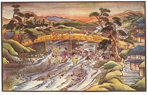 Fujitsuna could have let it go, putting another in its place; but that course would not have been up to the high standard of his morals in such matters. He had lost a half-cent which belonged to the Government. It was, he knew, in the river. Consequently, he refused to move on until it was recovered. That was clearly his duty. Awoto Fujitsuna ran to the houses at either end of the bridge, telling the villagers merely that he had dropped some Government money into the river—would they come and help him to find it? Of course they would, ready to help as the Japanese country-men have been from time immemorial. All followed Fujitsuna into the river—men, women, and children—and a diligent search was kept up by several hundreds for many hours, without result, when at last, just as the sun was setting, an old farmer picked up the half-cent, which he presented to Fujitsuna.