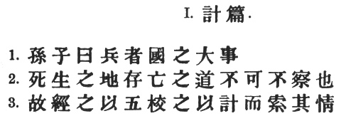 1:1 This is the only possible meaning of #, which M. Amiot and Capt. Calthrop wrongly translate "Fondements de l’art militaire" and "First principles" respectively. Ts‘ao Kung says it refers to the deliberations in the temple selected by the general for his temporary use, or as we should say, in his tent. See § 26.