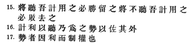3:3 The Yü Lan has an interpolated # before #. It is obvious, however, that the # just enumerated cannot be described as #. Capt. Calthrop, forced to give some rendering of the words which he had omitted in § 3, shows himself decidedly hazy: "Further, with regard to these and the following seven matters, the condition of the enemy must be compared with our own." He does not appear to see that the seven queries or considerations which follow arise directly out of the Five heads, instead of being supplementary to them.