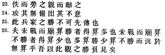 7:3 This seems to be the way in which Ts‘ao Kung understood the passage, and is perhaps the best sense to be got out of the text as it stands. Most of the commentators give the following explanation: "It is impossible to lay down rules for warfare before you come into touch with the enemy." This would be very plausible if it did not ignore #, which unmistakably refers to the maxims which Sun Tzŭ has been laying down. It is possible, of course, that # may be a later interpolation, in which case the sentence would practically mean: "Success in warfare cannot be taught." As an alternative, however, I would venture to suggest that a second # may have fallen out after #, so that we get: "These maxims for succeeding in war are the first that ought to be imparted."