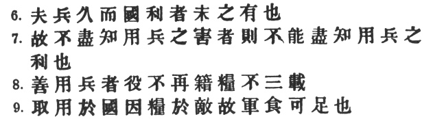 12:3 Once war is declared, he will not waste precious time in waiting for reinforcements, nor will he turn his army back for fresh supplies, but crosses the enemy's frontier without delay. This may seem an audacious policy to recommend, but with all great strategists, from Julius Caesar to Napoleon Buonaparte, the value of time—that is, being a little ahead of your opponent—has counted for more than either numerical superiority or the nicest calculations with regard to commissariat. # is used in the sense of #. The T‘ung Tien and Yü Lan have the inferior reading #. The commentators explain # by saying that the waggons are loaded once before passing the frontier, and that the army is met by a further consignment of supplies on the homeward march. The Yü Lan, however, reads # here as well.