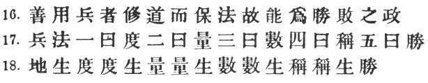 31:2 It is not easy to distinguish the four terms # very clearly. The first seems to be surveying and measurement of the ground, which enable us to # form an estimate of the enemy's strength, and to # make calculations based on the data thus obtained; we are thus led to # a general weighing-up, or comparison of the enemy's chances with our own; if the latter turn the scale, then # victory ensues. The chief difficulty lies in #, which some commentators take as a calculation of numbers, thereby making it nearly synonymous with #. Perhaps # is rather a consideration of the enemy's general position or condition (# or #), while # is the estimate of his numerical strength. On the other hand, Tu Mu defines # as #, and adds: # "the question of relative strength having been settled, we can bring the varied resources of cunning into play." Ho Shih seconds this interpretation, which is weakened, however, by the fact that # is given as logically consequent on #; this certainly points to the latter being a calculation of numbers. Of Capt. Calthrop's version the less said the better.