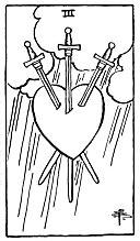 THEORY: The element of Earth on the Third house acts in the way of the mind and mental processes, and must appear as 'troubles,' etc., because it gives the feeling of the mind being burdened, which might easily go as far as oppression. If the burden becomes too heavy, either the body or the soul may suffer severely, and pain, affliction or mental aberration may ensue. This card must generally mean bad news too, the message which brings news of the affliction. It may be a corrective to a too easy and volatile imagination. It will in most cases denote some sickness, as a result of the pressure or oppressed feeling in the mind or in circumstances in general. It may be the result of worrying. The house of Gemini also suggests some suffering on account of distance, separateness, being far from one other. And the oppressed mind, which cannot have its