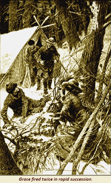 But Jim answered never a word. He lay there groaning in the snow, absolutely incapable of further mischief. As the other two men rushed to the door of the tent, Grace fired twice in rapid succession. But she was not firing to kill now; she had thought the whole thing out calmly and collectedly. It might be days before relief came to their aid from Overton; the snow might lie deep and the trail be wiped out. If she wounded any more of these rascals, she would have to tend them, and have them on her hands, and, for aught she knew, the tent was none too well provisioned.