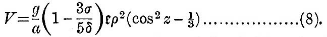 More generally, if we neglect the attraction of the fluid on itself, so that σ/δ is treated as small, and if ρ = α(1 + ς) be the equation to the surface of the fluid, where σ is a function of latitude and longitude, then the potential of the forces under which this is an equilibrium form is