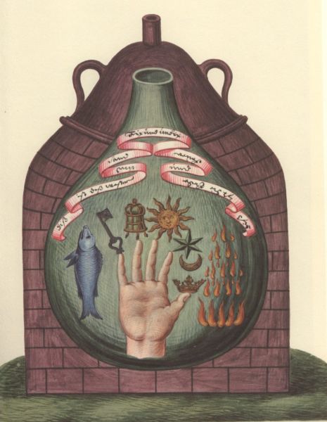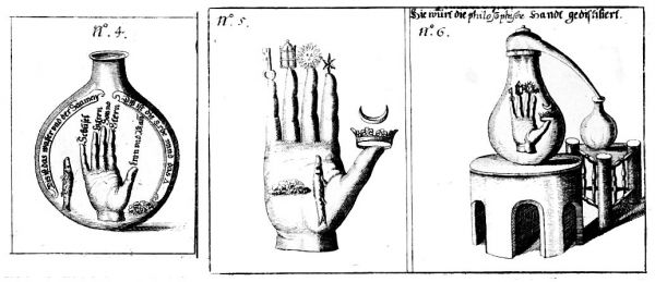 In 1647 the book Hermetischer Probier Stein (The hermetic touchstone or tested stone) was published at Franckfurt. It drew on the work of alchemist and professor of chemistry at Marburg, Oswald Croll (c. 1563 - 1609). It included short section 'Hermetischer Wunderbaum' (hermetic miracle tree) a series of engravings based on the Hand of the Philosophers. Here the creator of these emblems takes the Isaac Holland idea somewhat further by placing the hand with its symbols into a flask and distilling it.
