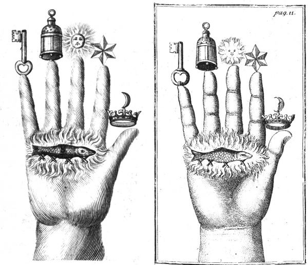 Alchemical Symbolism The Hand of the Philosophers. Back to alchemical symbolism index The emblem of the hand of the philosophers' should be quite familiar as it is often used in modern books on alchemy. This was originally an illustration in Isaac Holland's book Die Hand der Philosophen. The writings of Holland, who cannot yet be unidentified with a definite historical person, appeared at the end of the 16th century, and were revived in the mid 17th century and reprinted a number of times up to the end of the 18th century. The images placed on the hand are evocative, and it is tempting for people to interpret these through their present day belief systems, however, the author has left us a clear statement of their meaning. This is from his book Die Hand, of 1667. Below I show, on the left, the engraving from 1667 and, on the right, that from the 1743 version of the work. Those who have not this Hand and do not understand its secret signs... they do not possess the philosophers' treasure. In this Hand is locked the secret of the philosophers, that is, of the seed and the earth, as will be told later. Thumb. First look at the thumb on which a crown stands below the quarter moon. By this is meant saltpetre. For just as the thumb vigorously finishes off the hand, saltpetre does in the alchemical art, for he is the King and Lord of all salts. He is the mill through which everything must be ground. Index finger. The second sign and secret of the philosophers is the star with six points, standing above the forefinger next to the thumb. It is compared to Roman Vitriol, because no work that is to be perfect can be completed without vitriol, for it is the greatest and strongest salt after saltpetre. Middle finger. The third sign is the Sun standing above the middle finger. By it, Sal ammoniac is designated, for, apart from saltpetre and vitriol, nothing more powerful is found. Ring finger. The fourth sign of the philosophers is the lantern standing above the fourth finger of the Hand, whereby alum is indicated. For without alum, no perfect work can be accomplished, because it is required for the red and the white. It has an astonishing nature and a most subtle spirit. Little finger. The fifth secret and sign is the key of the philosophers, standing above the little finger. Simultaneously, it is the lock of the Hand. That is why the key is standing on it. By it, common salt is designated, for salt is the key in this art. Middle of the hand. The sixth secret sign is the fish. It stands in the middle of the Hand and signifies Mercury, for without Mercury or the fish nothing can be done. He is the beginning, the middle and the end, and he is the priest who must marry everything. He is the male and the seed; he is the water out of which all metals have originated; and he is the principal factor of all arts, and the greatest of all secrets. Palm. The seventh sign of the philosophers is fire. By this Sulphur is indicated. It is the earth and beginning of all metals. It is the female who brings forth the fruit. For no seed can grow unless it be first thrown into fertile soil. Then beautiful fruit will come from it. Thus it also happens that when a pure Mercury is joined to a pure Sulphur, this brings forth pure fruit. Thus, they are man and woman, father and mother, fire and water, seed and earth.