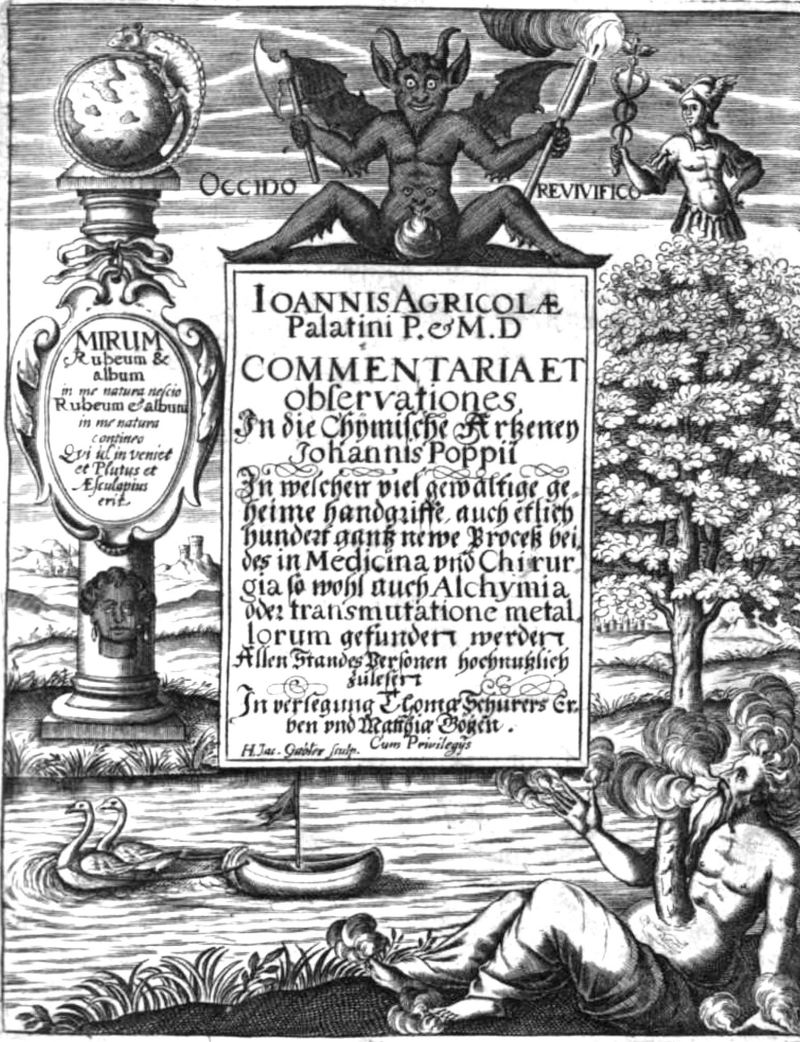 Emblematic Frontispieces Johann Agricola [1589-1643]. Commentariorum, Notarum, Observationum & Animadversionum in Johannis Poppii chymische Medicin, darinnen alle Process mit fleiss examinirt, von den Irrungen corrigirt, und mit etlich hundert newen Processen, geheimen Handgriffen, aus eigener Erfahrung vermehrt und illustrirt, Auch der rechte und warhafftige Gebrauch der Artzeneyen, mit etlich hundert Historien verificirt, Darneben was in Chirurgia und Alchimia oder transmutatione metallorum damit zu verrichten gründlichen offenbahret allen Standes-Personen, Medicis, Chirurgis, Chymicis, Balbirern, Feld-Scherern, Ross-ärtzten, Goldschmieden, und allen Haus-Wirthen hochnützlich zu lesen und zu gebrauchen. Leipzig, In verlegung Thomae Schürers S. Erben, und Matthiae Götzen. Gedruckt bey Gregorio Ritzschen 1638-39. Back to emblems page