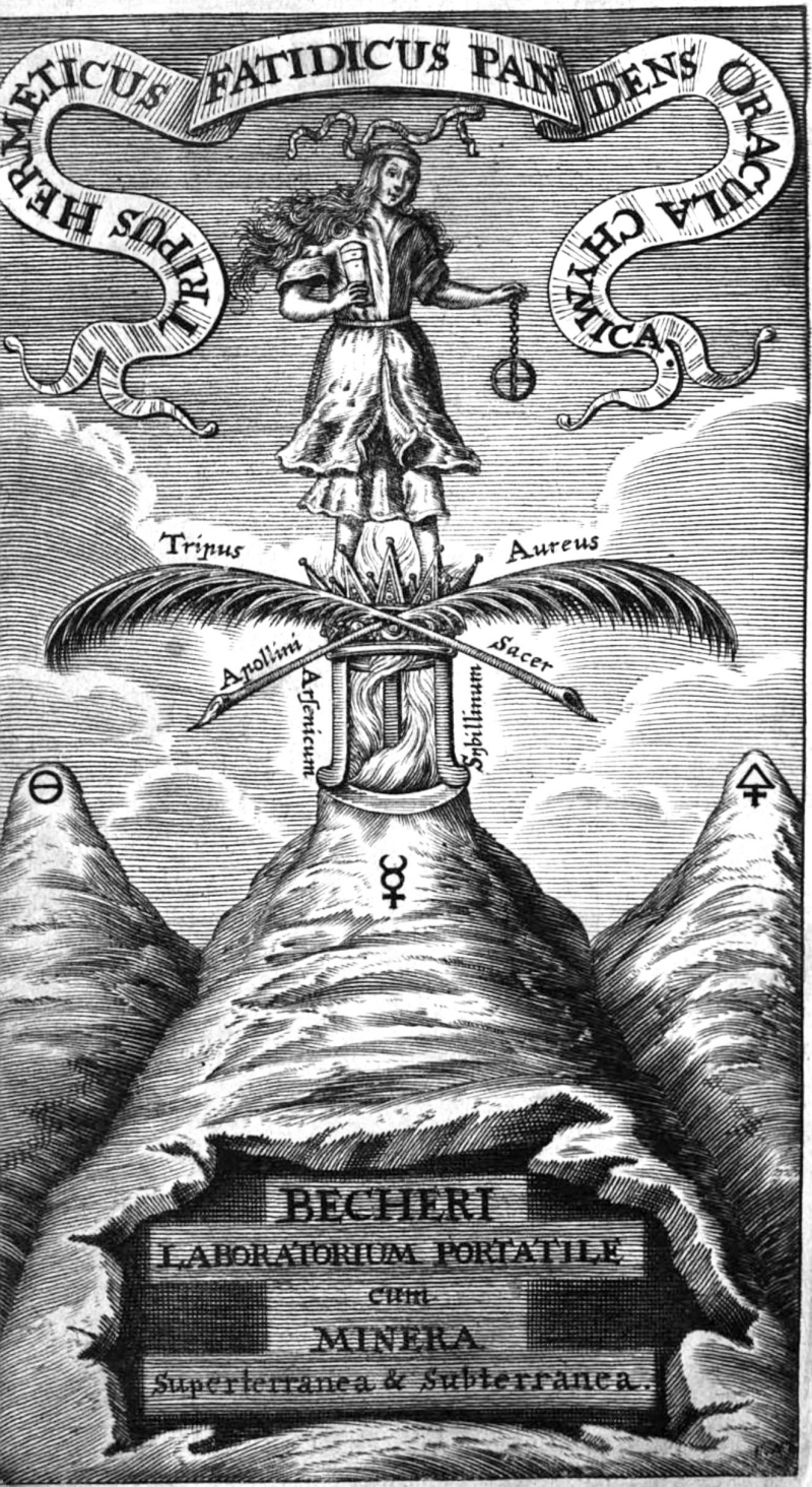 Emblematic Frontispieces Johann Joachim Becher [1635-1682] Tripus hermeticus fatidicus, pandens oracula chymica, seu I. Laboratorium portatile cum Methodo vere spagyrice, sc. juxta exigentiam Naturae, laborandi. Accessit pro Praxi & Exemplo II. Magnorum duorum productorum Nitri & Salis Textura & Anatomia, atque in omnium praecedentium confirmationem adjunctum est III. Alphabetum Minerale, seu viginti quatuor Theses de subterraneorum & mineralium genesi, Textura & Analysi. His accessit Concordantia Mercurii Lunae Omnia juxta authoris doctrinam & principia in Physica sua subterranea ejusque supplementis conscripta, adeo ut hic tripus Hermticus Commentarius Practicus super praefatam Physicam subterraneam vere dici queat, utpote scriptum raris Experimentis, multis Figuris et profundis Speculationibus innixium ut Lectori per se patebit. Exaratum in Cornubia ad extreme Angliae ora inter ipsa mineralia experimenta & autopsiam. Francofurti ad Moenum: Sumptibus Johannis Georgii Schiele 1689. Back to emblems page