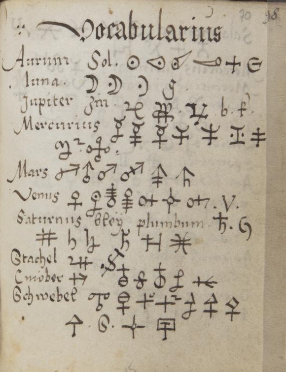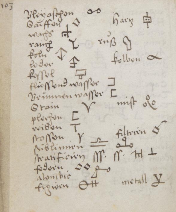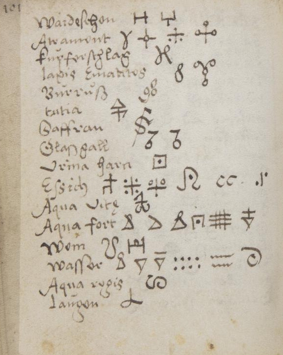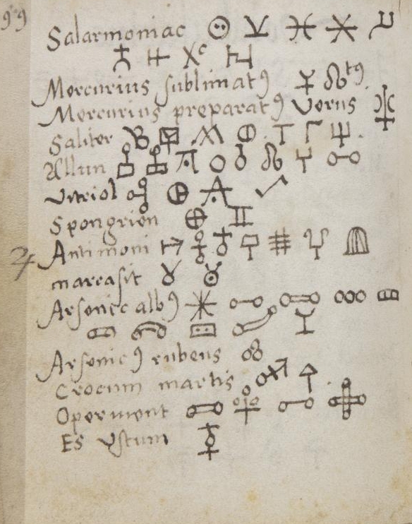 Alchemical imagery Graphic signs for substances and processes Images of alchemical apparatus, from Greek, Arabic and European sources. Alchemical emblematic imagery from books and manuscripts Paintings on alchemical themes Other material: Enochian, Rosicrucian or Elemental Chess Alchemical music [from Atalanta fugiens