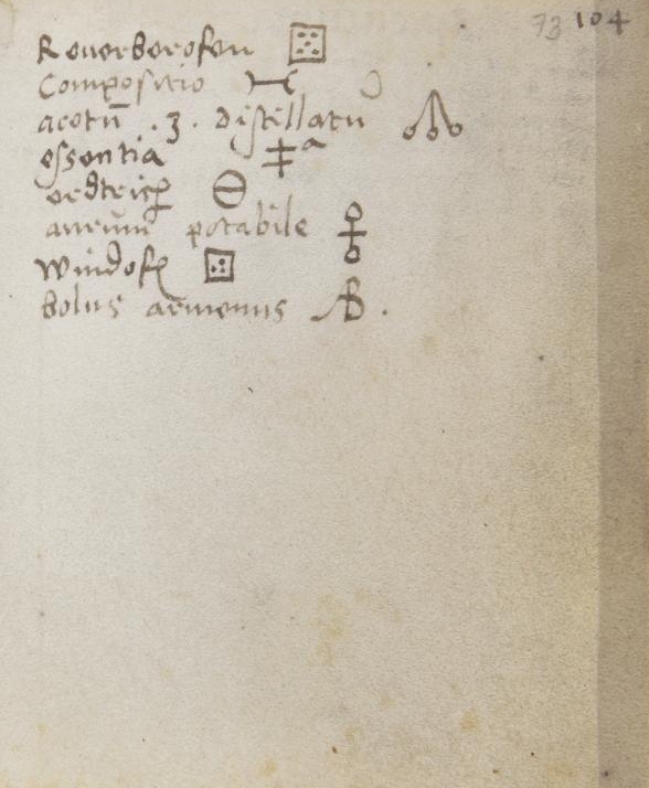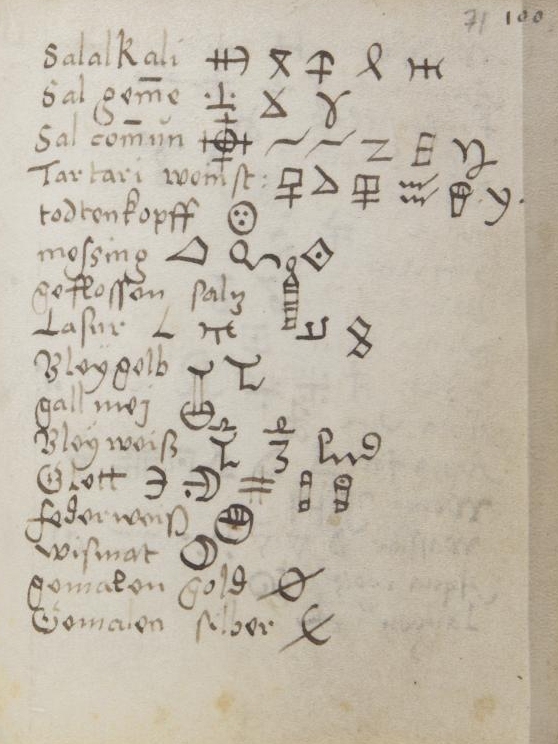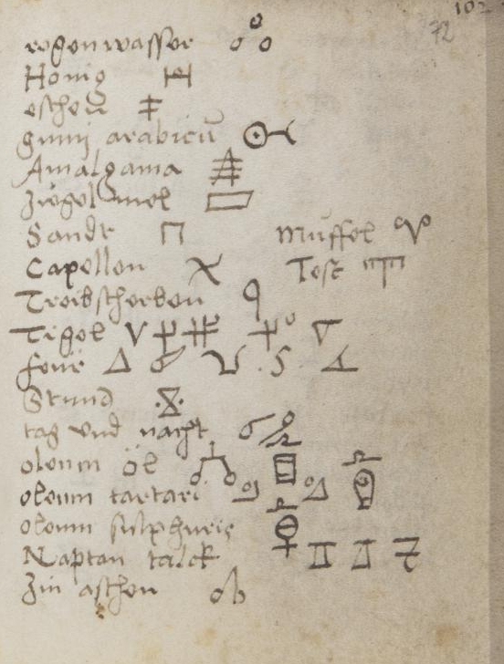 Alchemical symbols from a 16th Century manuscriptYale. Mellon MS 38. Caspar Harttung vom Hoff. Das Vade mecum. 1557Back to graphic symbols page ![]() ![]() ![]() ![]() ![]() ![]() ![]() |