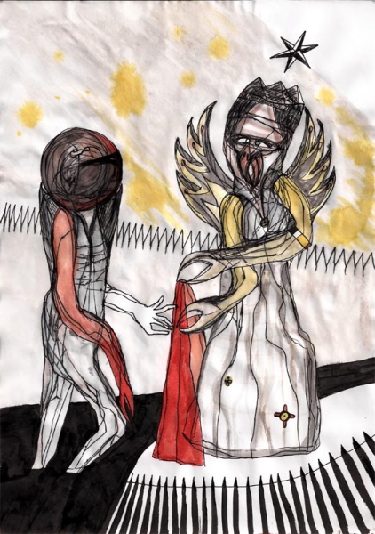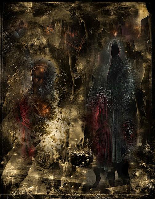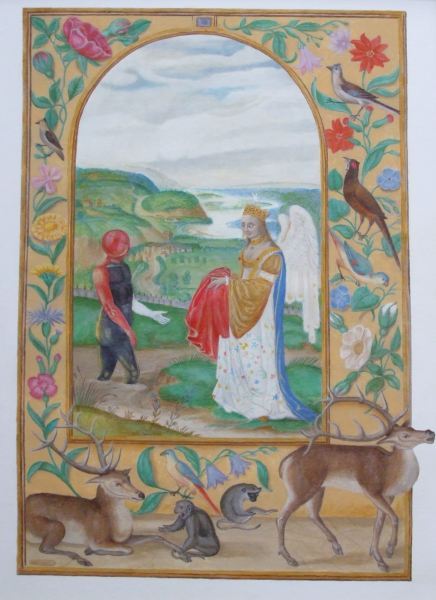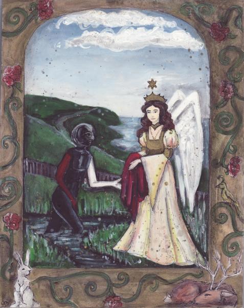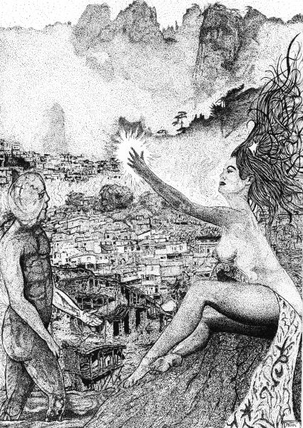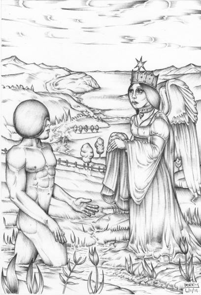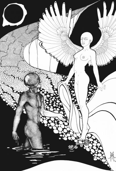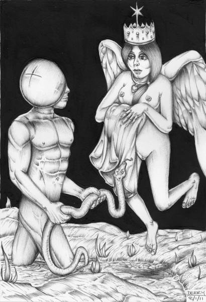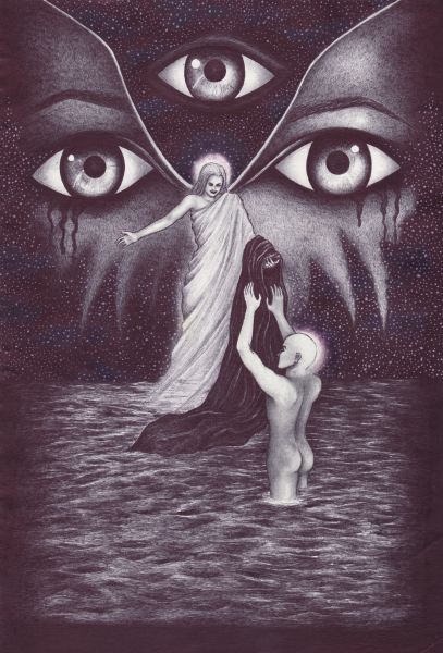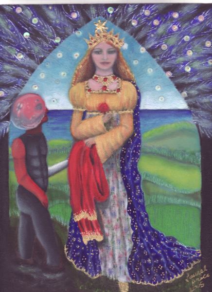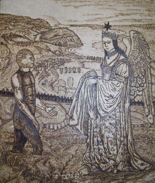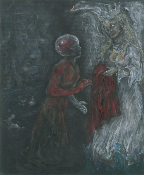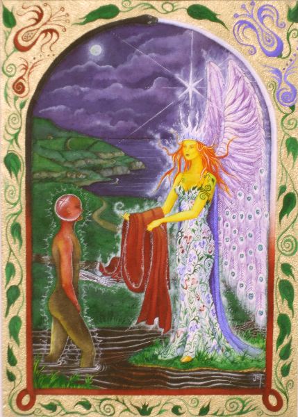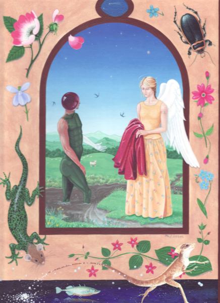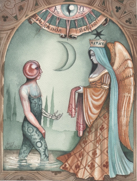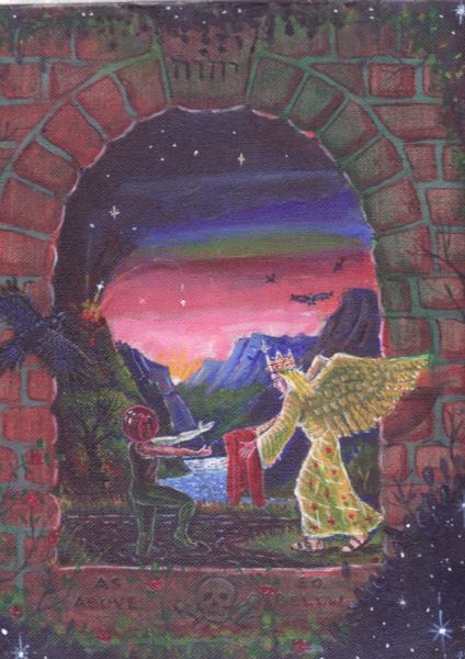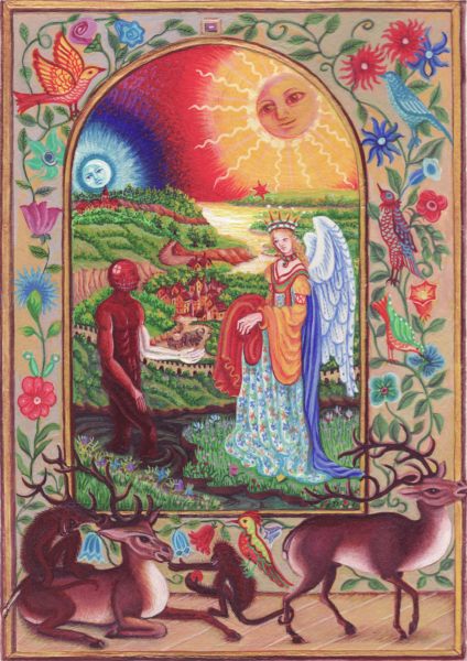 Splendor solis art project Image of the man emerging from the swamp I have always been fascinated by the eighth image from the Splendor Solis manuscripts. This shows the strange figure of a man emerging from a swamp. One arm is white, the other red and his body black, thus incorporating the main colour changes in the alchemical process. His head is metamorphosed into a glassy sphere, and that I find a wonderful image. As he walks out of the swamp, an angel figure appears and hands him a red robe. Some years ago I made a facsimile copy of the main part of the image. It sat on my wall for a few months and then I sold it. A year or so later I found I was somewhat missing this image and I asked an artist friend of mine, Phil Gibson, to make a version of it in his own style, but keeping the central core of imagery. I was so pleased with this that I decided to ask other artists to make a version of this image in their own style. Bob Ellaby and Laurel Price next made versions for me. This is an ongoing project and I am now going to commission other artists, whose painting or drawing styles I admire, to make further copies. Eventually, if I can afford to continue with this project, hopefully I will in time gather ten to twenty such artworks and then I may be able to mount an exhibition of this theme. Back to Alchemy and Art page
