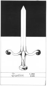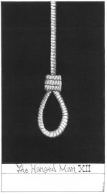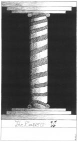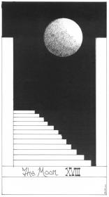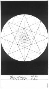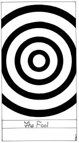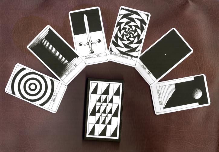 Peter Rotin's tarot is in black and white. It is primarily an abstract deck reducing the imagery of each arcana to a minimum while still retaining their essence and power. His deck also works with the polarities of dark and light, and the ways in which they weave together to give form and substance to the ideas. Thus the Emperor is minimalised to the idea of the column linking the earth and the heavens. The Fool is a series of four concentric circles, the outermost of which is broken by the frame, perhaps indicating the danger and loss of focus on the centre that the Fool finds on his journey. Though these images are minimalist they are not simplistic and a great deal of thought has gone into structuring the deck. Peter Rotin's fine sense of line and geometry makes his tarot transcend the mere descriptive as he shows in his forms the essence he has found in the tarot archetypes. The image for the box may at first glance seem merely decorative, but instead it hides a little tarot secret.22 Major arcana deck. Card size 4.25 by 2.4 inches (108 by 62mm). Signed and numbered by the artist. Available now ! The retail price for this black and white tarot is £33 ($57). Postage to UK and Europe is £2. Postage to the USA and Rest of the World is $8. Sorry. Edition sold out. ![]()
