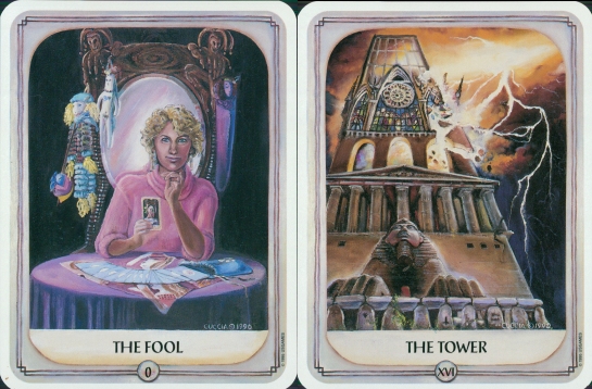 The suits correspond to the ancient peoples of different continents, Staves to Africa, Swords to Asia primarily Japan, Cups to European, and Sacred Circles to North American shamanism. The Fool is a self-portait of the artist, while the Tower, shows a Megalithic monument, Egyptian Sphynx, Greek Temple, Romanesque medieval church, Gothic cathedral and modern skyscraper office block built one on top of the other.