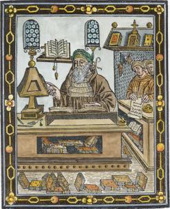 EMB21. Woodcut portrait of Albertus Magnus in his study from Liber Secretorum Alberti Magni, 1502.