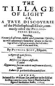 The Tillage of Light or, a True Discoverie of the Philosophicall Elixir, commonly called the Philosophers Stone. Serving, To enrich all true, noble and generous Spirits, as will adventure some few labors in the tillage of such a light, as is worthy the best observance of the most wise. London, 1623.