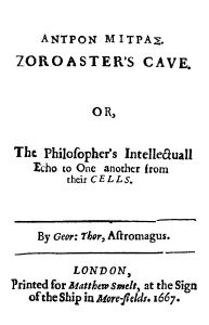 Zoroaster's Cave. Or, The Philosopher's Intellectuall Echo to one another from their Cells. London, 1667.