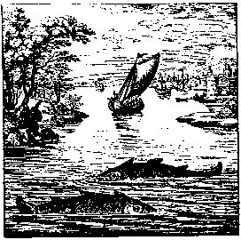 Two fishes swim in opposite directions on the surface of a lake or sea. In the background some sailors in a boat raise their arms in greeting.